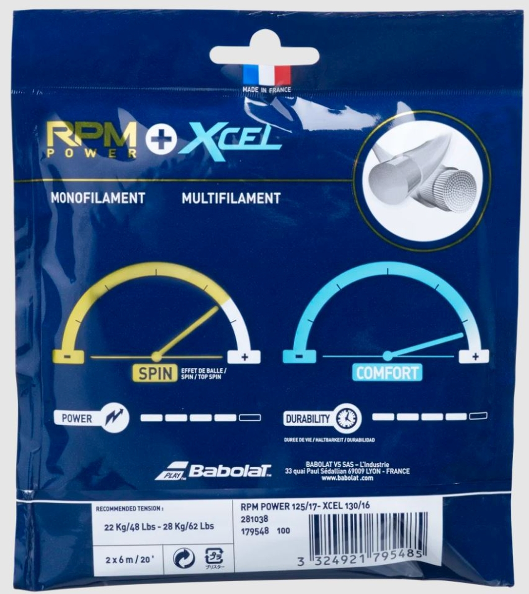 Babolat Hybrid RPM Power 17g + Xcel 16g oferă spin, putere, durabilitate și senzație jocului tău. Indiferent dacă te joci cu poliester și cauți mai multă putere și senzație sau vrei mai multă rotație și durabilitate, dar nu vrei să folosești un pat plin de poliester: această combinație hibridă trebuie încercată.
