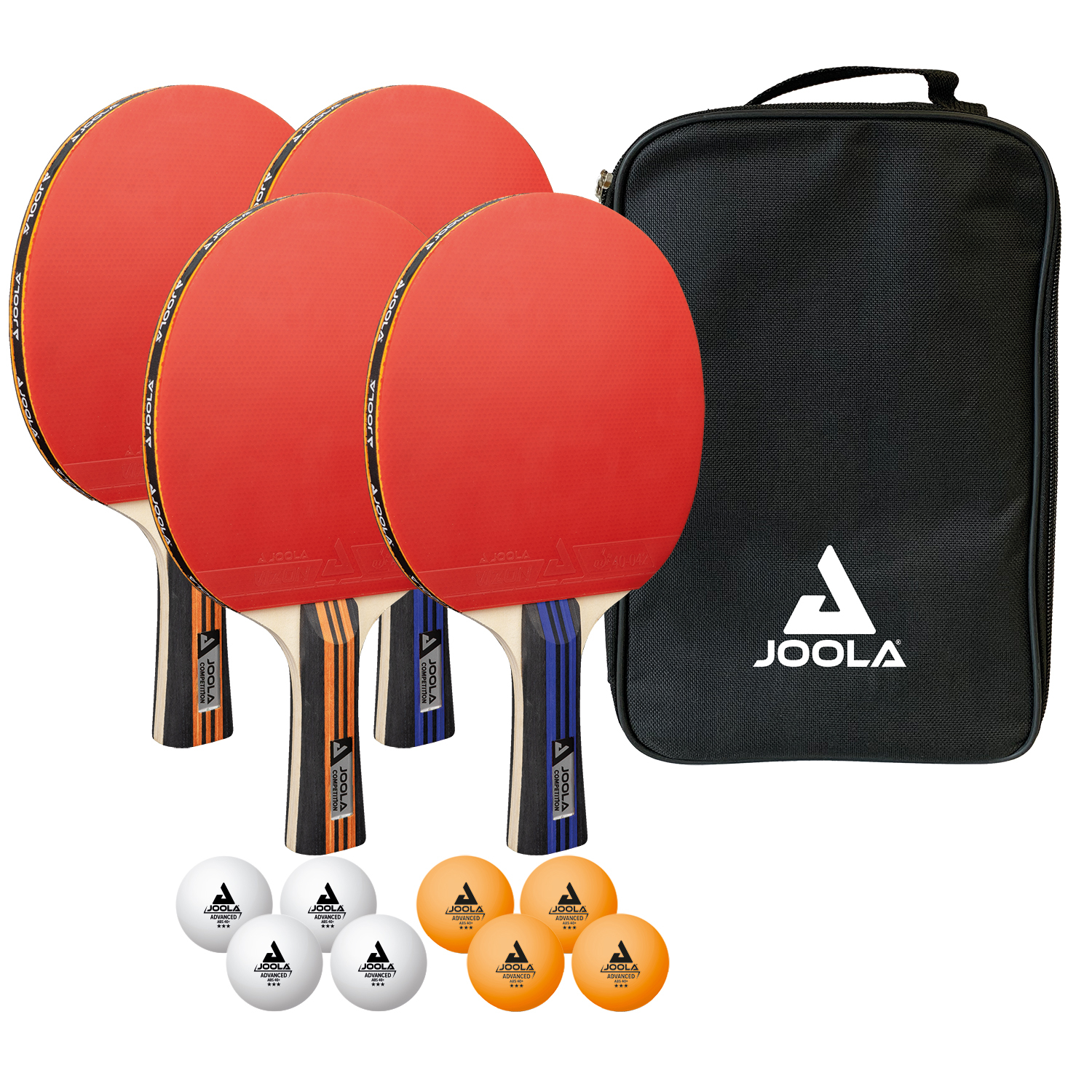 Cu setul de tenis de masă JOOLA FAMILY Advanced, distracția în familie este garantată! Setul de tenis de masă FAMILY Advanced este format din 4 rachete de tenis de masă JOOLA și 4 mingi de tenis de masă fiecare în alb și portocaliu. În geanta practică și la îndemână toate rachetele și mingile își găsesc locul pentru depozitare.